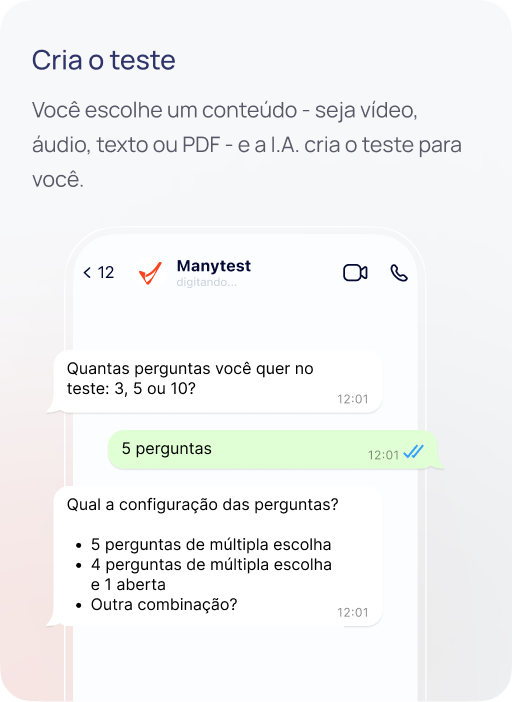 Pelo WhatsApp ou pela plataforma, você cria em minutos testes completos com perguntas, correção e certificados.